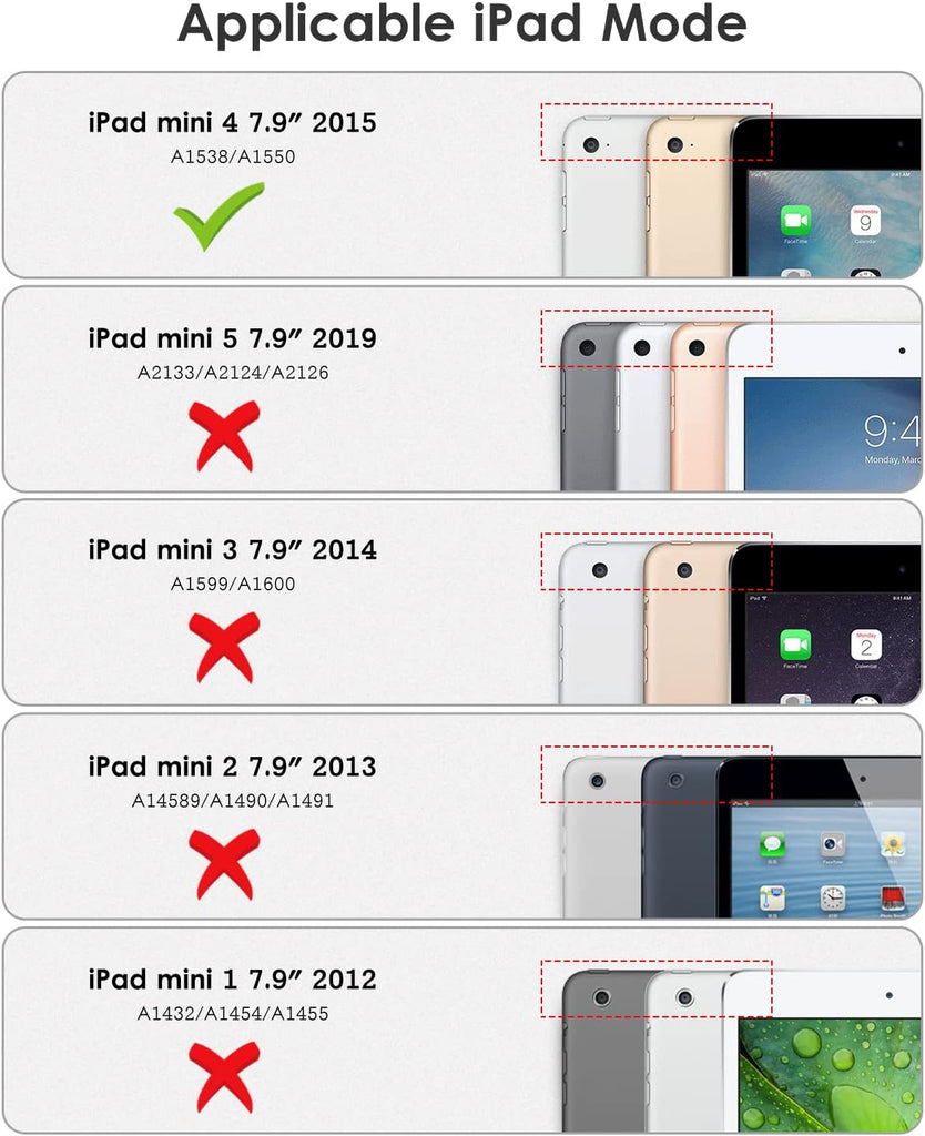 🌟【Compatibility】 - Designed for the Apple iPad Mini 4 tablet 2015 New released (model A1538, A1550) only. NOT compatible with any other iPad models. 🌟【Upgrade Design】- Internal Honeycomb Grid Cushion release 80% more heat than other cases, extending your iPad lifespan. Microfiber lining, soft TPU back case to prevent daily drop, and screen scratch for your iPad Mini. 🌟【Magnetic Smart Cover】- Built-in magnetic strip provides Auto Sleep/Wake features, and reduces battery drain. A magnetic tri-fold front case props up your device at stable angles to provide two positions for comfortable Viewing or Typing. 🌟【 Slim and Stylish 】Precise cutouts for all buttons and ports with just 0.05-inch Thickness, Minimalist shape, crystal clear back, and beautiful colors bring you to ease and comfort at any time. ⭐【Lifetime Warranty 】DTTO Offers Lifetime Free Replacement for Your IPad Case. (Needs to be activated within 30 days of purchasing) Your Satisfaction Is Our Top Concern.