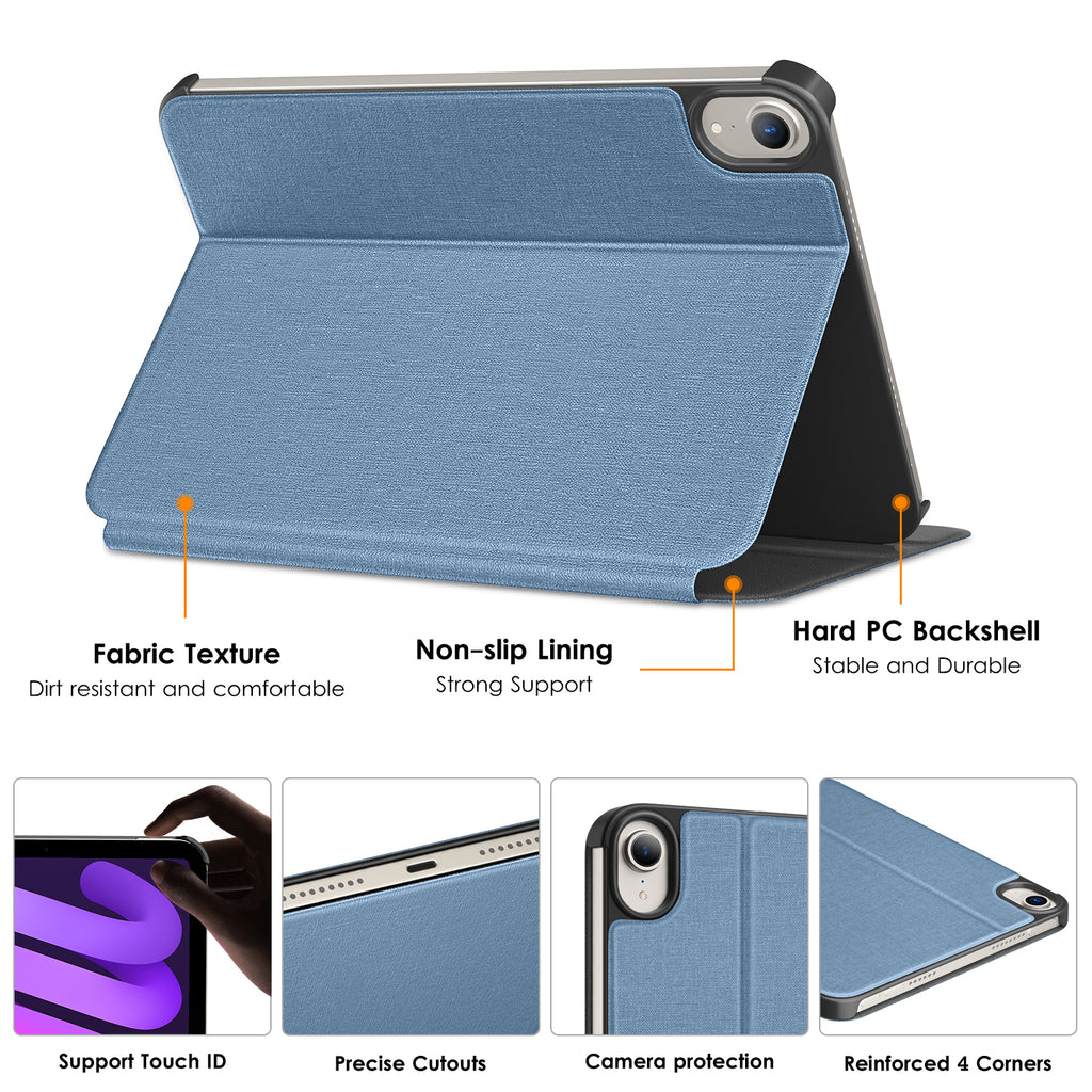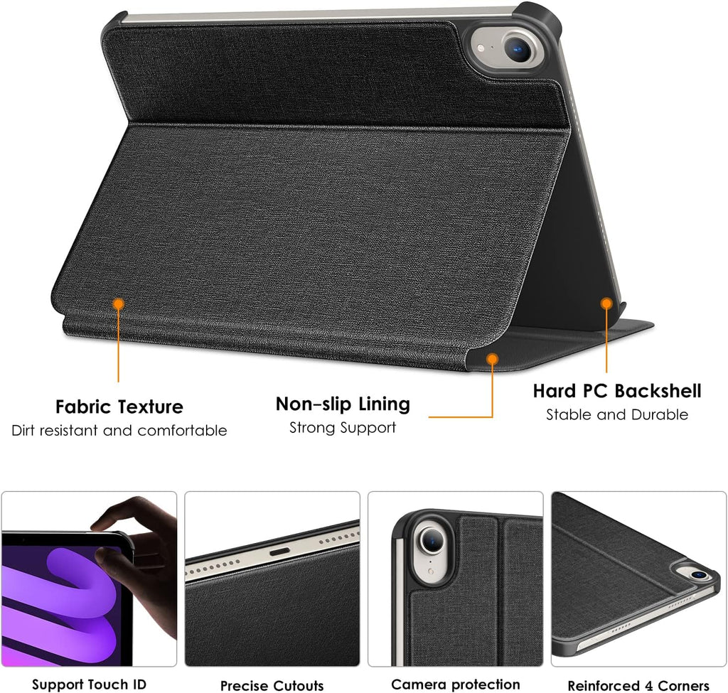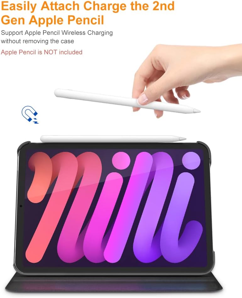 [Compatible Devices] - Designed for IPad Mini 6th generation 8.3-inch 2021 (model number: A2567, A2568, A2569) [Lightweight hard back design] - Adds minimal bulk while offering your device great protection against accidental drops and bumps [Multifunctional] - Support Touch ID and iPad 2nd Pencil Charging/Pair; Auto Sleep/Wake; Magnet secures the case closure; Two stand angles. [Precise Cutouts] - Full access to all features (Cameras, Speaker, Ports and Buttons) and easy snap on and off [Customer Supremacy] - DTTO Offers lifetime free replacement for our Cases ( Don't forget to be activated our Lifetime Warranty within 30 days after received ).
