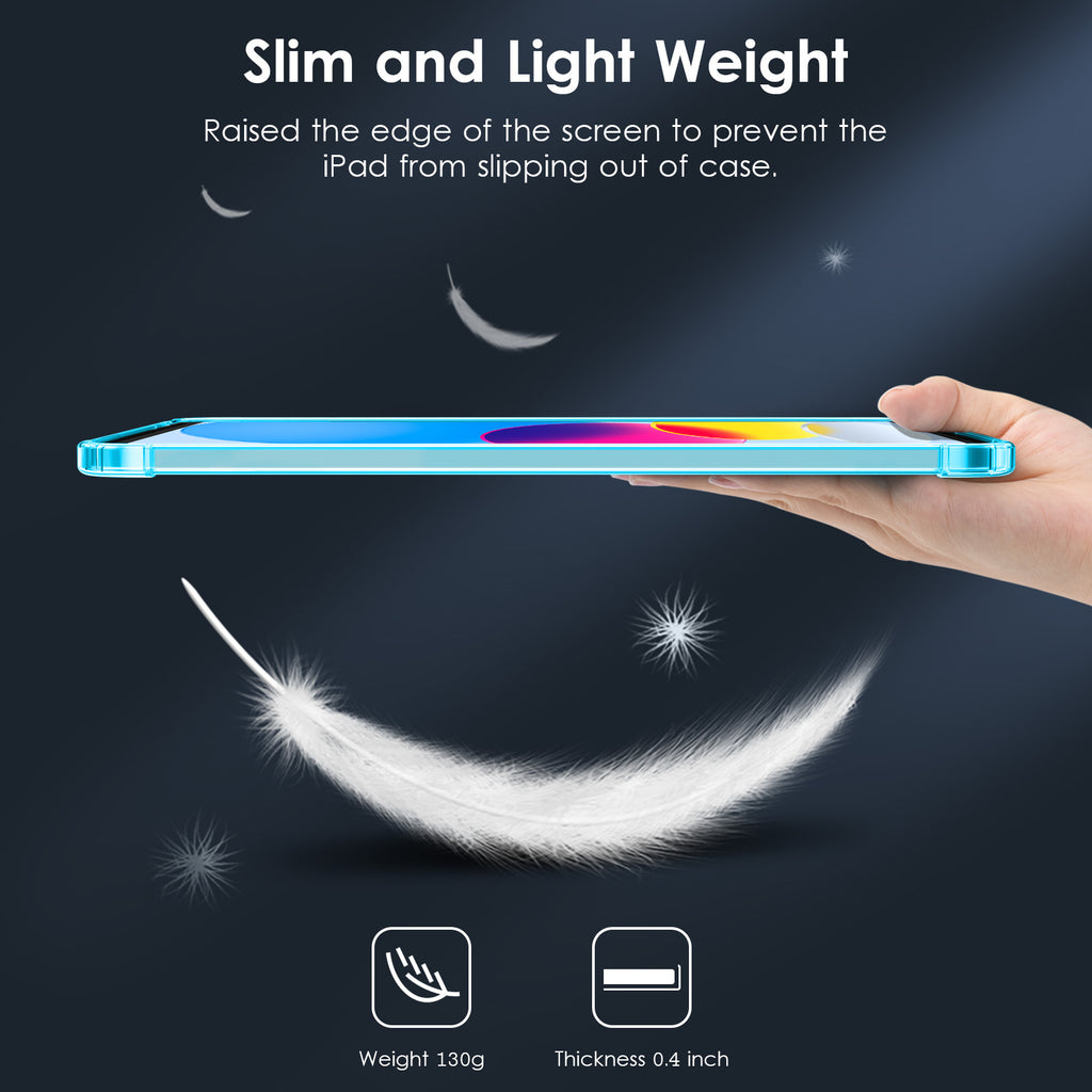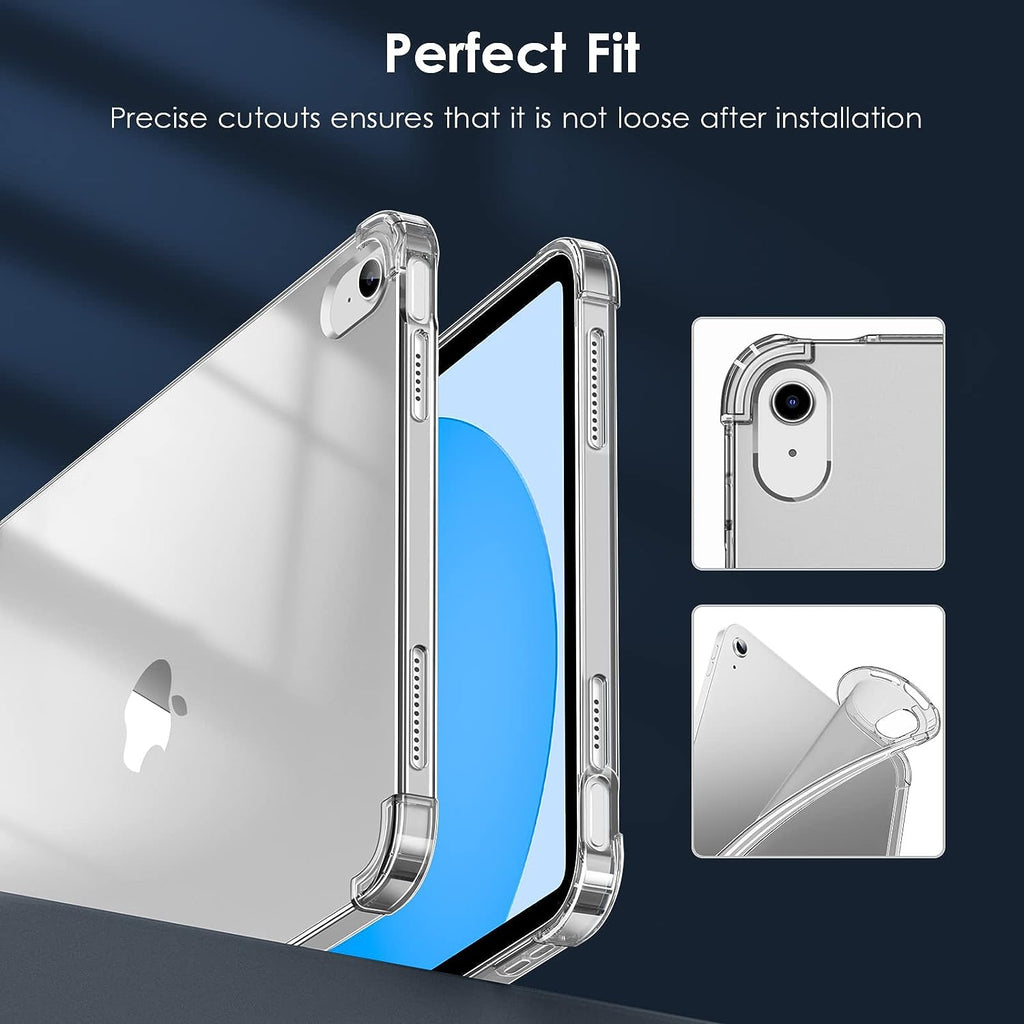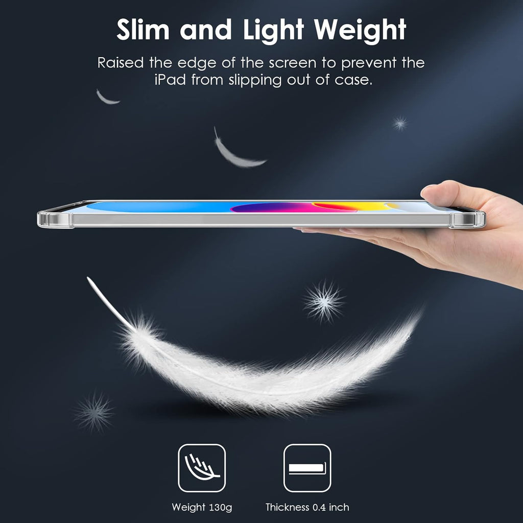 【Compatibility】Only compatible with iPad 10th generation 10.9" 2022 released.Please check the back of iPad to confirm the model. 【Crystal Clear&Anti-yellowing】Add anti-UV material, ensure the logo visible and let the world see your new iPad 10. Stains can be easily wiped away. 【Slim & Lightweight】Made of soft TPU material, back-only design will not increase the bulk of your iPad 10th generation case. 【Corner Protection】Reinforced 4 air cushion corners can provide shock absorption and cushioning protection when falling. 【Precious cutout】Allows easy access to all buttons, ports, sensors, speakers & camera.Let your iPad 10th gen fit snugly in the case.