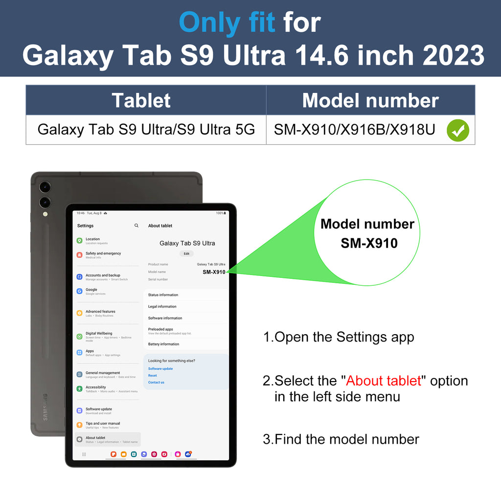 ⭐Compatibility - Specifically designed for the Samsung Galaxy Tab S9 Ultra 14.6 inch Case 2023 Released Tablet(Model Number: SM-X910/X916B/X918U). Not compatible with any other Samsung tablet model.    ⭐Adjustable Angles - Built-in leather hand strap (one-handed operation), multiple horizontal bracket angles for comfortable watching movie or typing.    ⭐Auto Sleep/Wake - Front cover have Auto Wakes/Sleep function, external elastic band and magnetic buckle enhances magnetic closure (reduces battery drain).    ⭐Premium Material - Exterior is made of premium synthetic leather, lined with microfiber provide full protection for your tablet.    ⭐Multi Function Features - Supports S Pen magnetic and wireless charging when case is on. Please NOTE: S Pen is not included. Front document card pocket to keep notes, cash, cards.