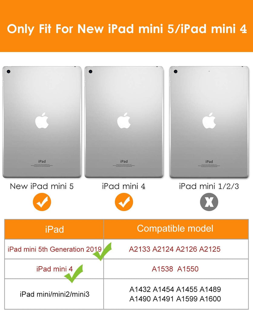 Compatible Model - Perfect fit for 2019 iPad mini 5 (A2133/A2124/A2125/2126)/ mini 4 (A1538, A1550) . NOT compatible with any other iPad models (includeing iPad mini 1/2/3). Please check back bottom of your iPad to find the model number. Durable Material - Made of exterior PU(polyurethane), inner microfiber lining and back flexible soft TPU, which featured strong front screen protection and back anti-scratch of iPad. Lifetime Warranty! Precise cut-outs - New generation soft case adopt cutouts design in all buttons, easy access to your iPad's function without a bit of pressure. Viewing and Typing Stand Mode - Tri-fold front cover with dual standing positions for facetime / movie viewing and keyboard typing. Magnetic auto sleep/wake function help extend your iPad's battery life. Ultra Lightweight - Slim and lightweight design won't add a lot of bulk to your iPad, convenient to carry it go everywhere. Also easy to install and remove.