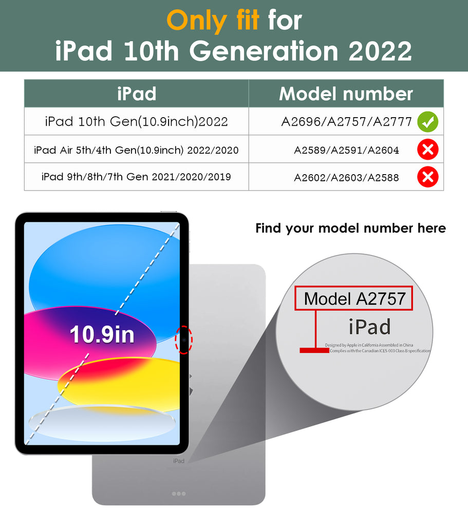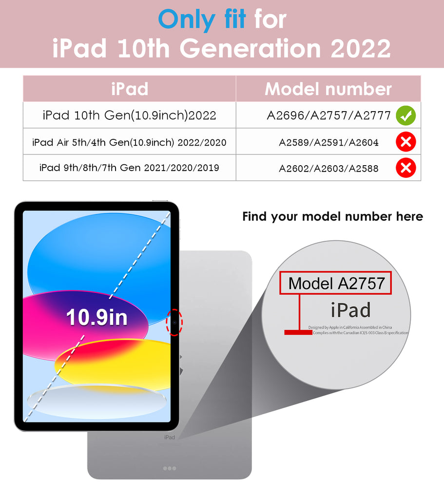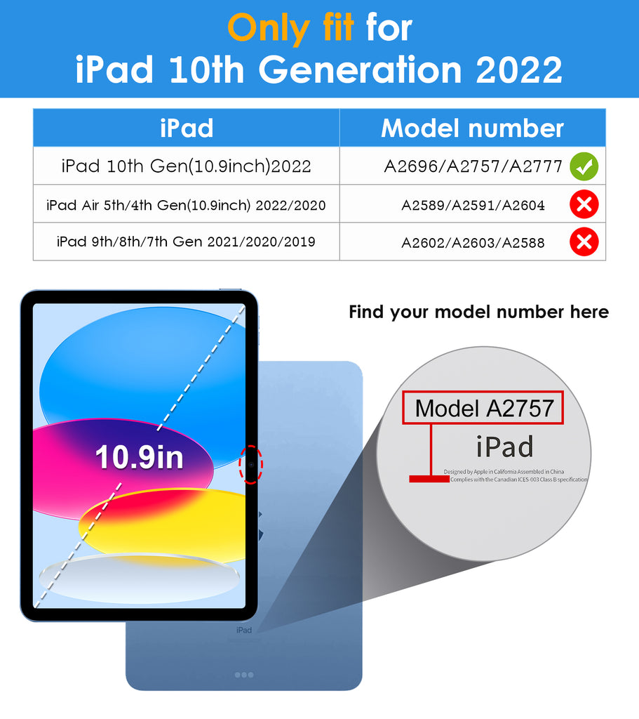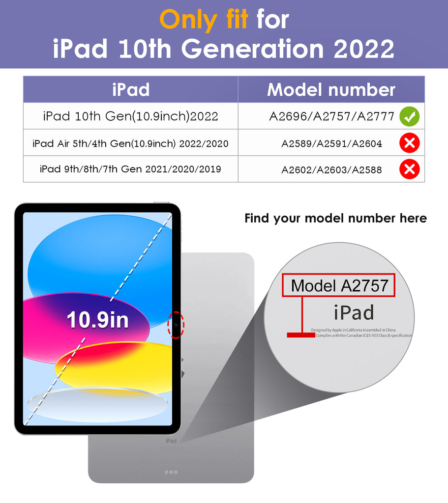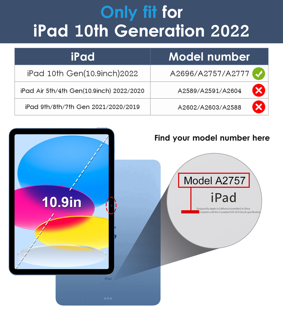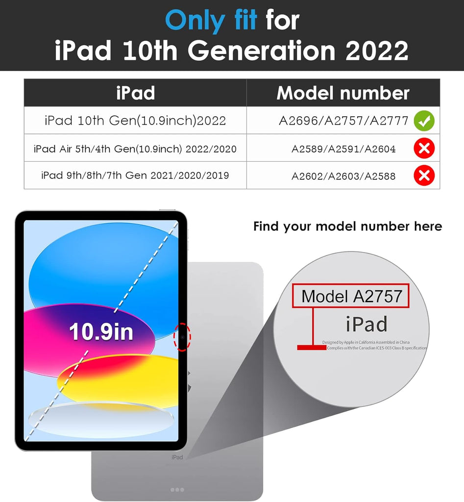 🌟【Compatibility】- Exclusively designed for iPad 10th Generation 10.9’’ 2022 Release. NOTE: Not compatible with any other devices. Please check your iPad on the back bottom to confirm the "AXXX" model number before purchasing (Model Number: A2757/A2777).    🌟【Upgrade Design】- Internal Honeycomb Grid Cushion release 80% more heat than other cases, extending your iPad lifespan. Microfiber lining, soft TPU back case to prevent daily drop, and screen scratch for your iPad 10th cover.    🌟【Multi-Function】- Support Touch ID. Pencil Holder conveniently places and easy push out your pencil via the hole in the back, Not easy to lose. NOTE: Apple pencils are not included.    🌟【Magnetic Smart Cover】- Built-in magnetic strip provides Auto Sleep/Wake features, and reduces battery drain. A magnetic tri-fold front case props up your device at stable angles to provide two positions for comfortable Viewing or Typing.    🌟【Lifetime Warranty】- DTTO Offers Lifetime Free Replacement for Your iPad 10th Generation case(Needs to be activated within 30 days of purchasing). Your Satisfaction is Our Top Concern.
