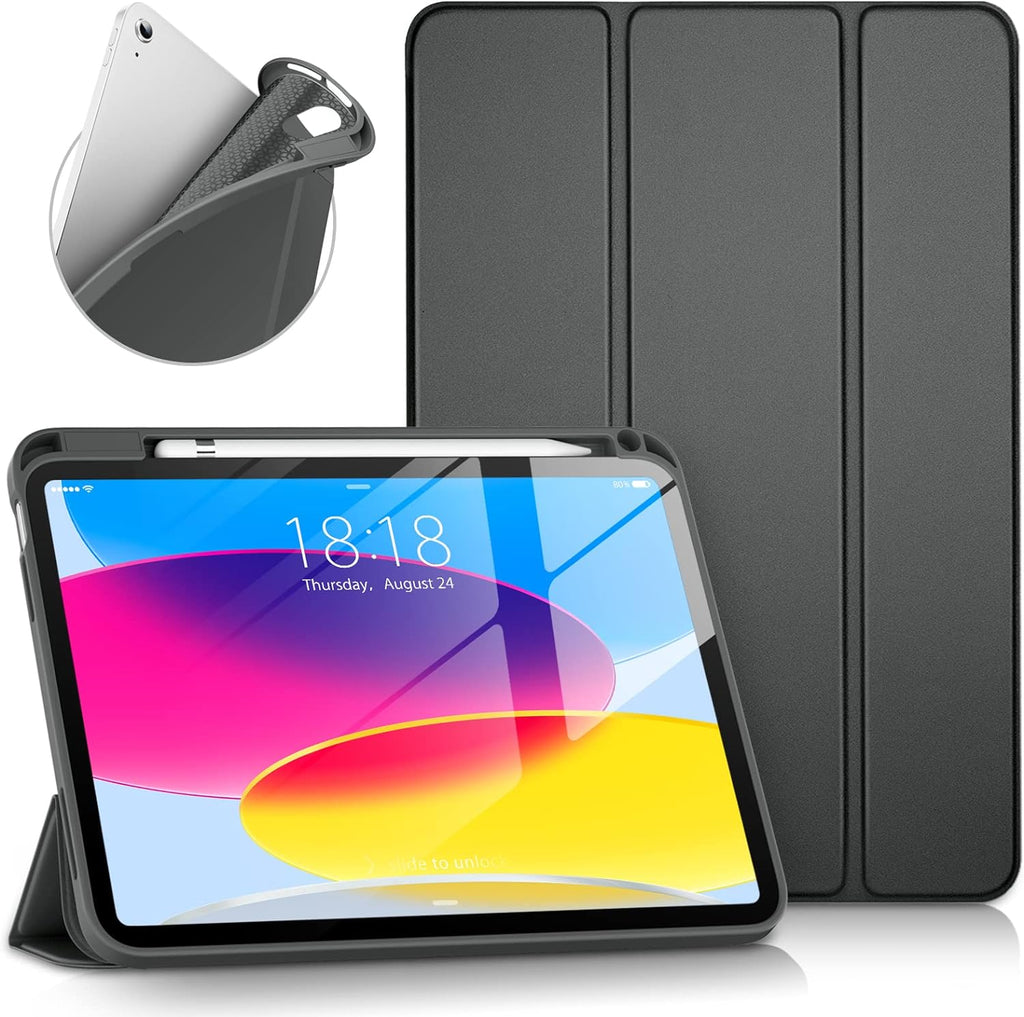 DTTO iPad 10th Generation Case 10.9 Inch 2022, Slim Tri-fold Stand Soft TPU Back with Pencil Holder for iPad 10 Case - Support Touch ID, Auto Sleep/Wake, and Honeycomb Grid Cushion, Black