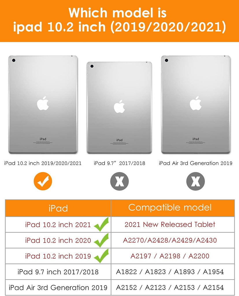 【Tailor-making】 - Designed for the Apple iPad 9th /8th /7th Generation 10.2" 2021 & 2020 & 2019 Released (Model Number: A2602 / A2603 / A2604 / A2605 / A2428 / A2429 / A2270 / A2430 / A2197 / A2200 / A2198). Not Compatible with any Other iPad Model.      【Soft TPU Back】 - This protective case is made of high-quality TPU material. Softback cover makes it easier to install and remove against scratches, shocks, drops than other hard back cases.      【Adjustable Angles】 - Strong magnetic connection to create a stable viewing stand for your tablet. Two angles are provided for satisfying your viewing and typing needs. You can free your hands from other entertainments.      【Auto Wake/Sleep】- The smart case has a built-in magnetic strip. If you open or close the case, the iPad will automatically wake or sleep. Reduce battery consumption and extend the iPad standby time.      【Customer Supremacy】 - DTTO Offers lifetime free replacement for our Cases ( Don't forget to be activated our Lifetime Warranty within 30 days after received ).