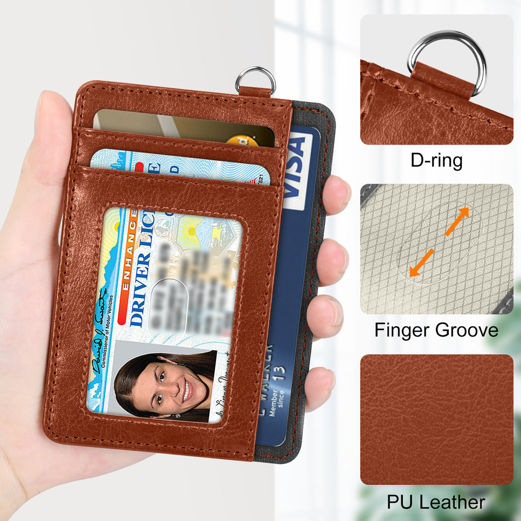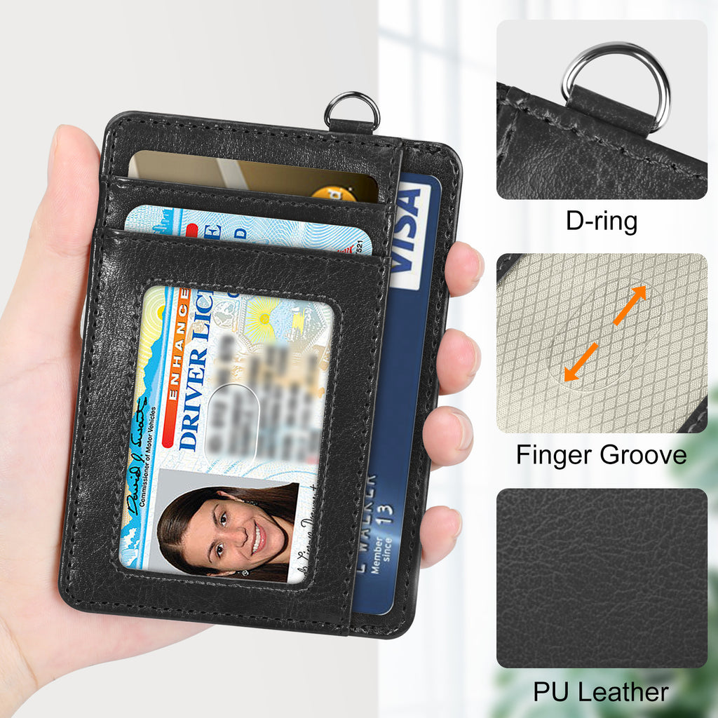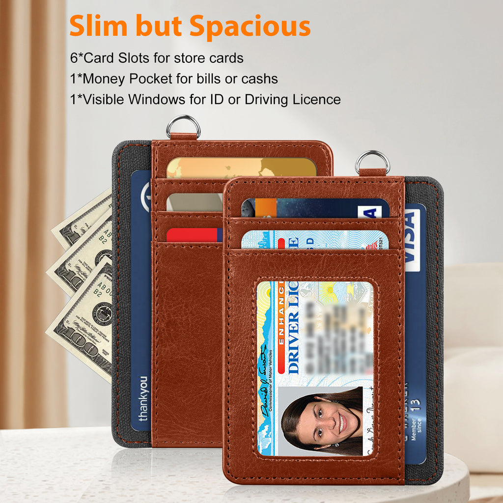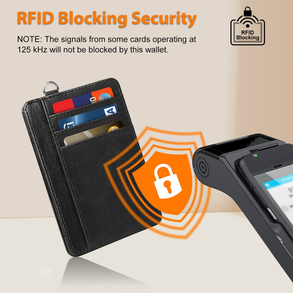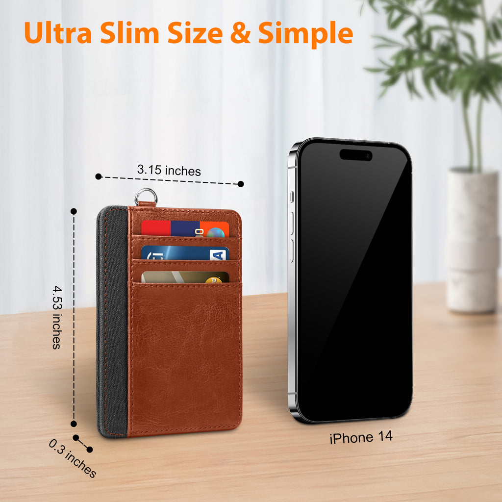 Durable Materials: Each ultra-thin ID card bag is made of durable PU leather with a non-slip canvas lining to prevent the card from dropping. With a D-ring, you can hang this minimalist card bag anywhere. Customized card slots for each credit card ensure that the cards are easy to reach and do not fall out.      Wide Application: Measuring only 4.53*3.15*0.32 inches, the slim wallet can hold up to 7 cards, a small amount of cash, and 1 transparent window designed for an ID card or driver's license. The whole card case is compact and lightweight, suitable for pockets, handbag and backpacks. Bring safety and convenience to your life and travel.      RFID Security: This RFID wallet card case uses RFID-blocking material to protect your card information from being scanned by unauthorized machines. Protect your privacy when traveling or shopping.      Perfect Gift: Classic appearance and color, functional and unisex design, whether it is for boyfriend, girlfriend, family, colleagues, or children are very suitable.      100% After-Sale: If you have any issue, please contact us, we will get back to you in 24 hours and give you a satisfactory solution. Thank you so much for your support!